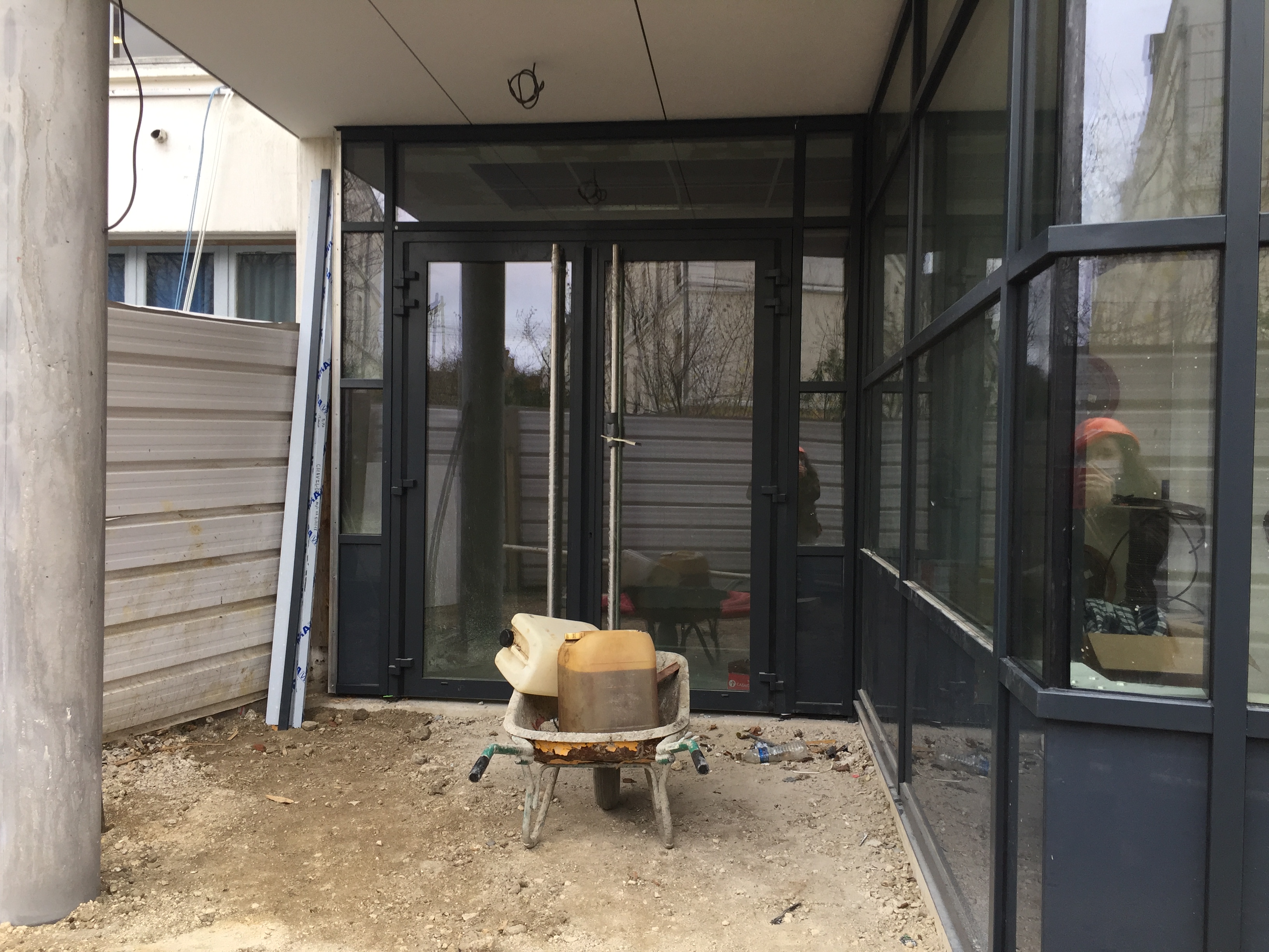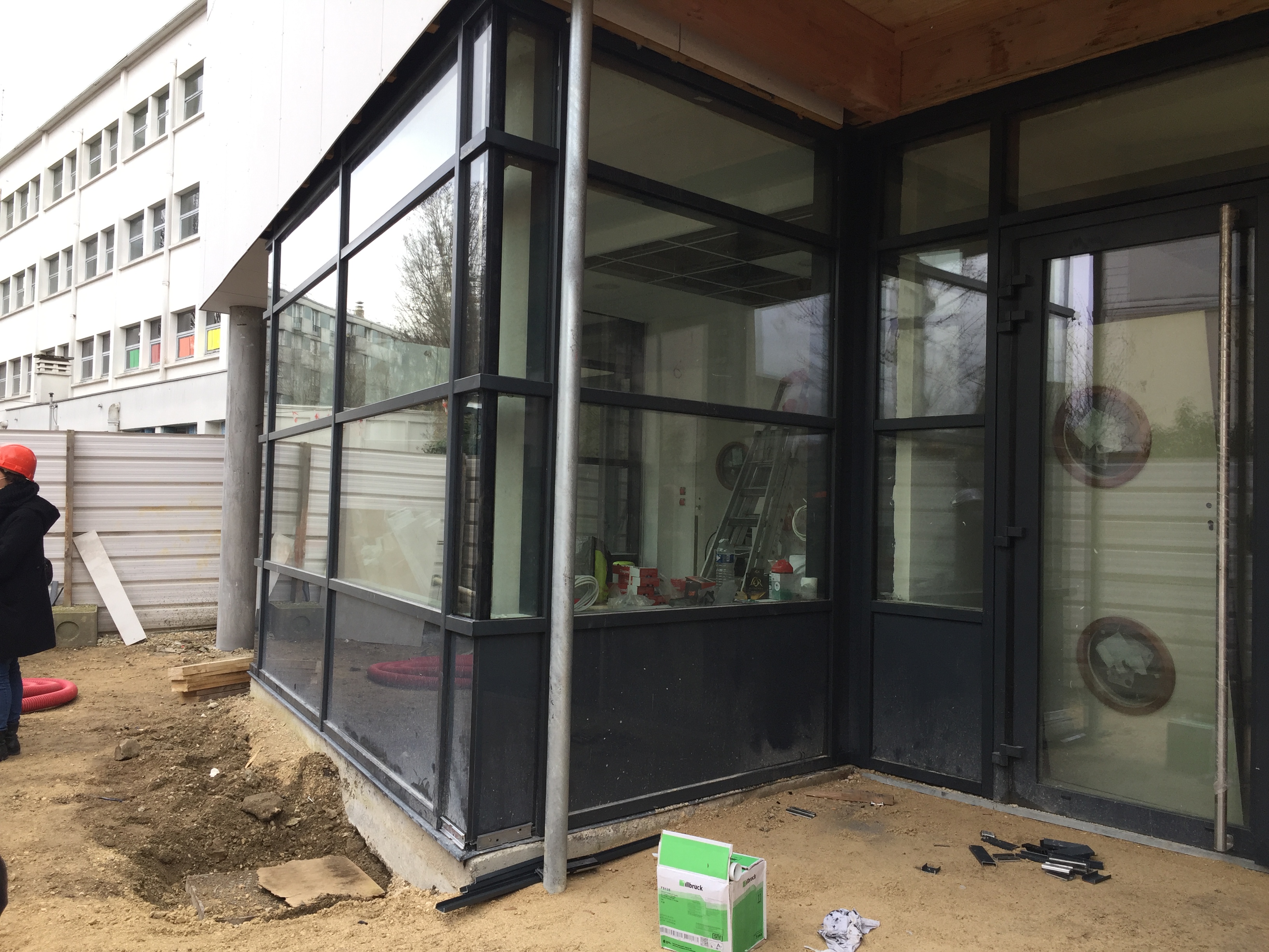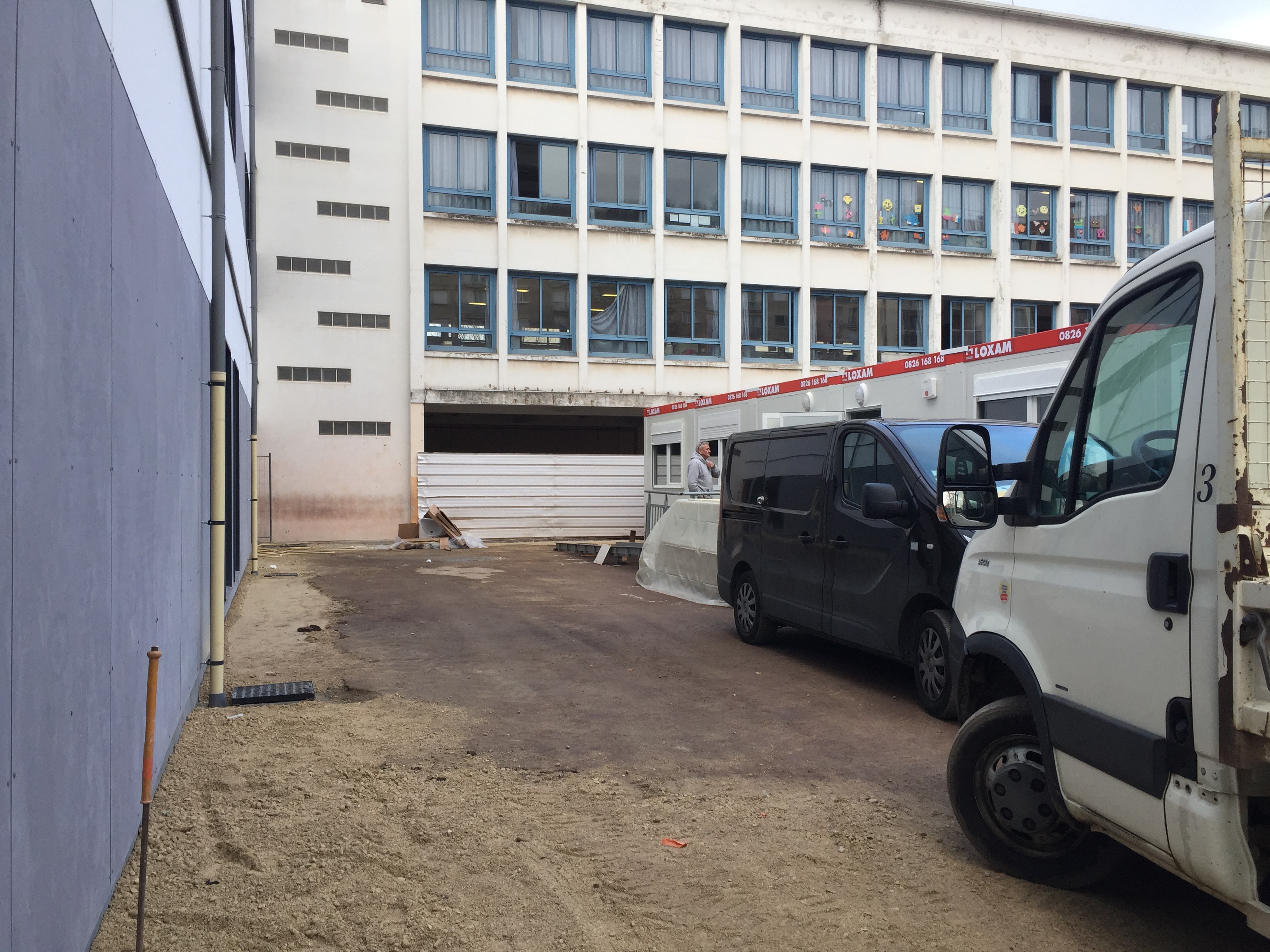 Deux classes seront installées dans deux constructions modulaires dans la cour, côté Anatole (5). Des fenêtres donnent aussi sur la clôture de chantier, côté cour d’Anatole.